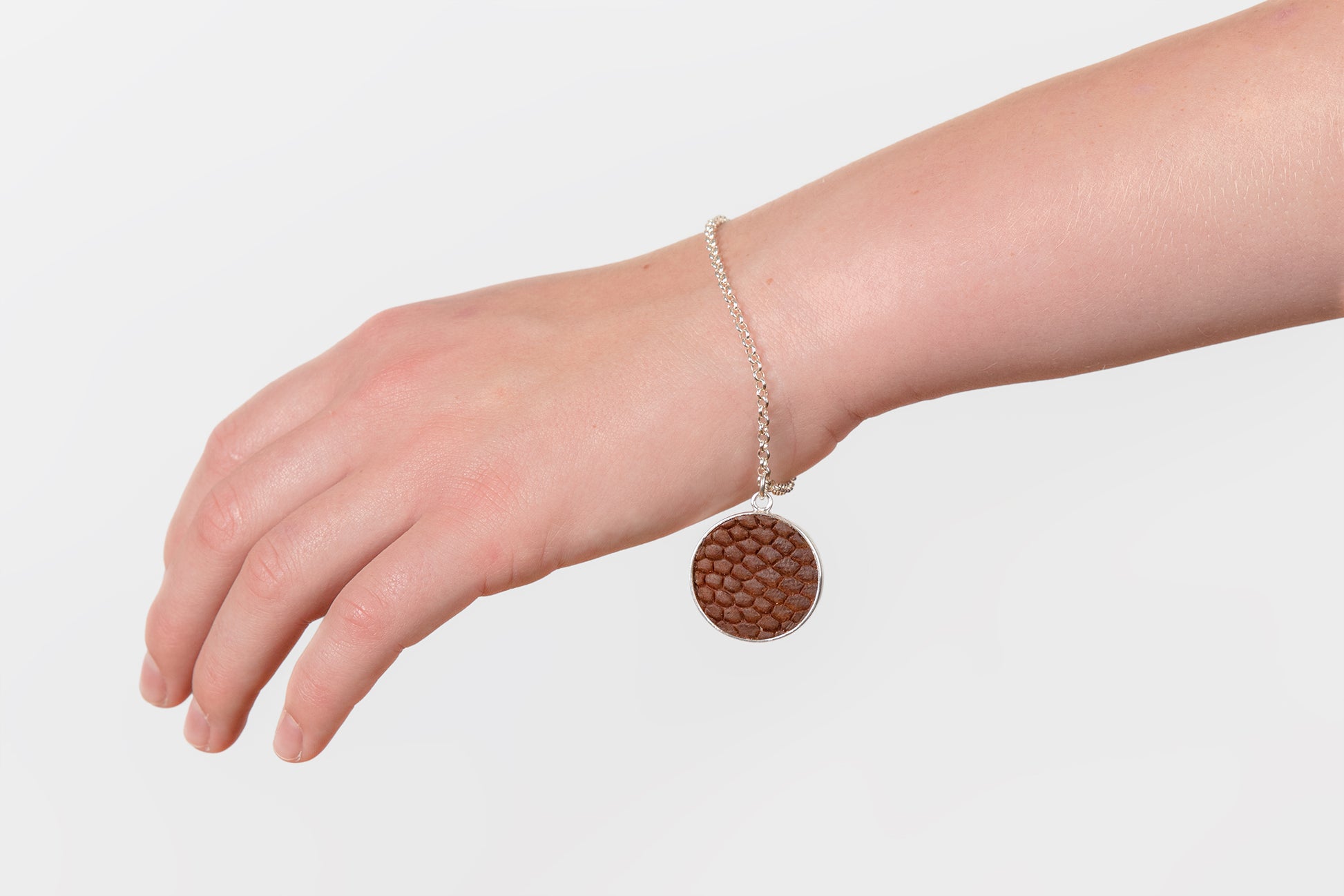 Berlock med barkgarvat bäversvansläder hängande från kedja.